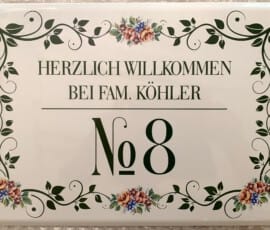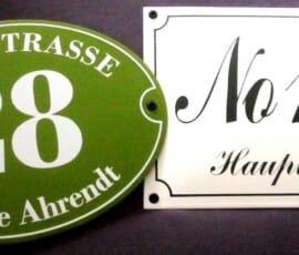 Egal ob nur die Hausnummer oder eine Kombination aus Straße, Namen und Hausnummer, jedes Haus verdient sein eigenes individuelles Schild, das mehrere Generationen überlebt. Ein edles Hausschild altert zusammen mit seinem Haus und den Bewohnern und wird mit den Jahren nur immer schöner.