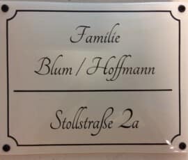 Alle Hausschilder und Namensschilder sind in verschiedenen Größen, Ausführungen (Facette oder gewölbt) und auch Farbgebung zu haben. Standard ist immer weiß mit schwarzer Beschriftung („weiß/schwarz) sowie ultramarineblau mit weißer Beschriftung („blau/weiß“).