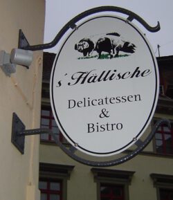 Eine erstklassige Ausschilderung z.B. für Ladengeschäfte oder Gastronomiebetriebe, vor allem in der historischen Altstadt. Angebracht an der Hausfassade oder in Verbindung mit einer passenden geschmiedeten Halterung, dem typischen „Ausleger“, den wir je nach Möglichkeit ebenfalls fertigen.
